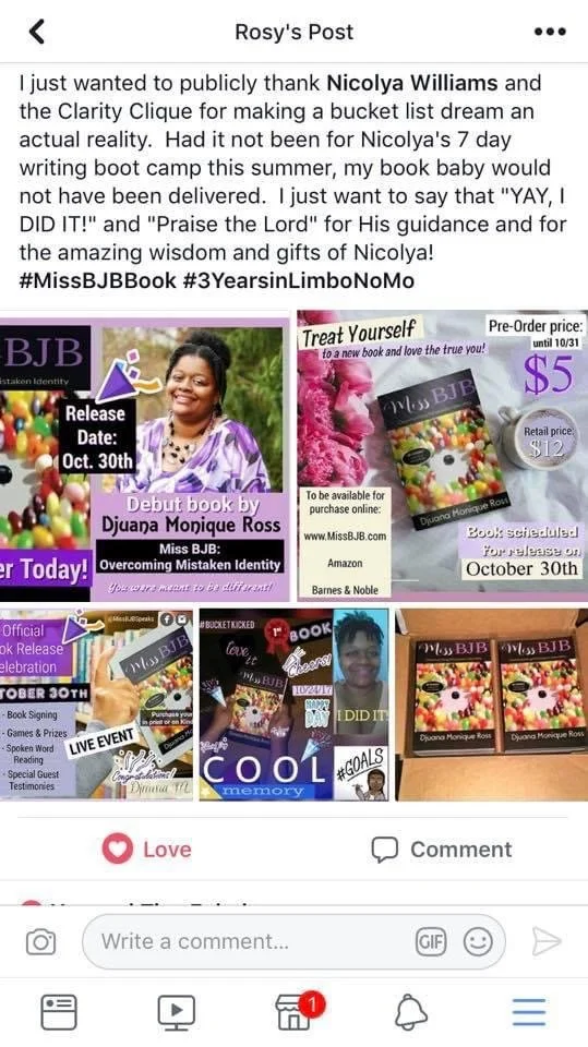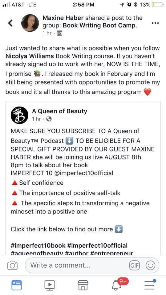 When I started writing my book I was in the midst of an entire life shift. I was changing jobs and back in school. I felt like it would be impossible to find energy and time to dedicate to my book. When I met Nicolya I was able to find ways to make my book a priority and for that I am forever grateful. The truth is without the book writing boot camp I would have put it off for many more decades!