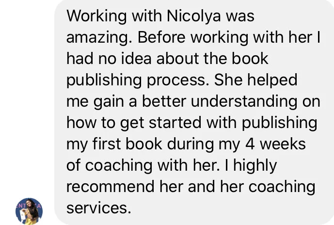 Nicolya is a passionate publishing powerhouse! She is able to guide and support authors through the entire book writing, publishing, and profiting process- saving writers time, energy and money. She is truly an author's secret weapon to book publishing success with the clarity and confidence she helps create in writers. I highly recommend that new and even seasoned authors connect with Nicolya if they want to get their message to the masses. You won't regret it!